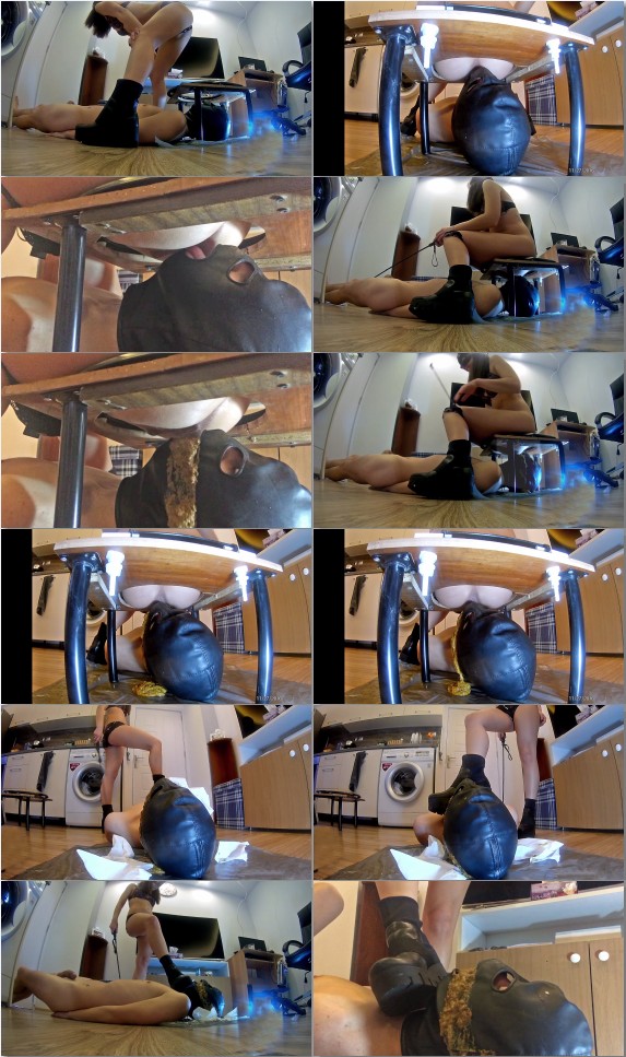 a sexy scat mistress feeds her personal human toilet with liquid shit